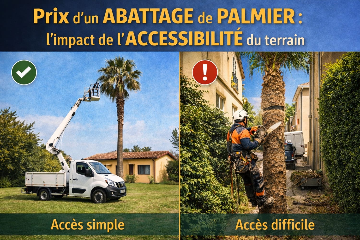 Au-delà de la hauteur du palmier, un autre facteur joue un rôle déterminant dans le prix d’un abattage : l’accessibilité du terrain.